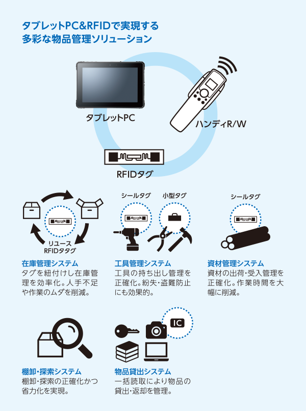 ICタグに記録した情報を、電波で非接触かつ一括で読み書きできる自動認識技術のこと。バーコードのように1つずつ近接照合する必要がなく、見通し外でも読み取れる(運用条件による)ため、棚卸やモノの所在確認の効率化に威力を発揮する。