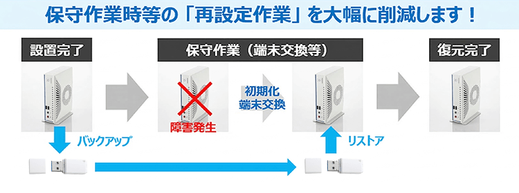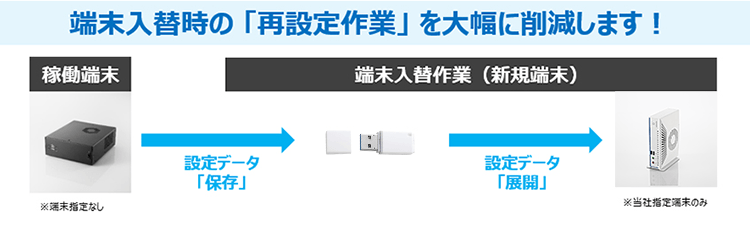 新旧端末の入れ替え作業の再設定時間を大幅に短縮することが可能です。